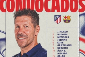 马竞对阵巴萨次回合名单:小蜘蛛在列,奥布拉克、卡尔多索回归